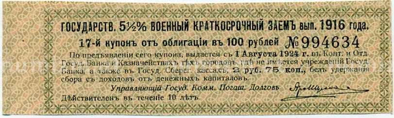 Купон от облигации 100 рублей 1916 года «Государственный военный краткосрочный заем» (Артикул: T11-27006): подробные характеристики, качественные фотографии в высоком разрешении, низкая цена.