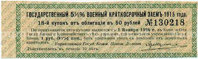 Купить Купон от облигации 50 рублей 1915 года «Государственный военный краткосрочный заем» по привлекательной цене можно в нашем интернет-магазине — Вам достаточно оформить заказ на сайте. Все монеты, представленные в каталоге, находятся в наличии на нашем складе.