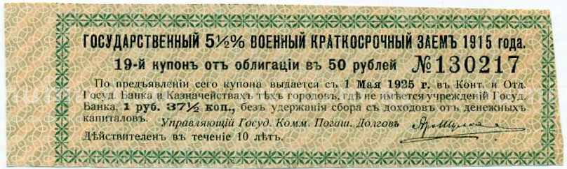 Купон от облигации 50 рублей 1915 года «Государственный военный краткосрочный заем» (Артикул: T11-27010): подробные характеристики, качественные фотографии в высоком разрешении, низкая цена.