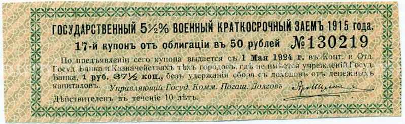 Купить Купон от облигации 50 рублей 1915 года «Государственный военный краткосрочный заем» по привлекательной цене можно в нашем интернет-магазине — Вам достаточно оформить заказ на сайте. Все монеты, представленные в каталоге, находятся в наличии на нашем складе.