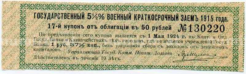 Купон от облигации 50 рублей 1915 года «Государственный военный краткосрочный заем» (Артикул: T11-27015): подробные характеристики, качественные фотографии в высоком разрешении, низкая цена.