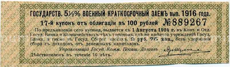 Купон от облигации 100 рублей 1916 года «Государственный военный краткосрочный заем» (Артикул: T11-27017): подробные характеристики, качественные фотографии в высоком разрешении, низкая цена.