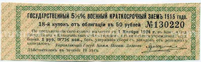 Купон от облигации 50 рублей 1915 года «Государственный военный краткосрочный заем» (Артикул: T11-27021): подробные характеристики, качественные фотографии в высоком разрешении, низкая цена.