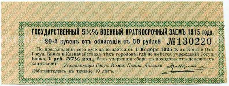 Купон от облигации 50 рублей 1915 года «Государственный военный краткосрочный заем» (Артикул: T11-27022): подробные характеристики, качественные фотографии в высоком разрешении, низкая цена.