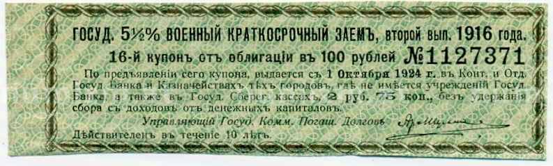 Купон от облигации 100 рублей 1916 года «Государственный военный краткосрочный заем» (Артикул: T11-27074): подробные характеристики, качественные фотографии в высоком разрешении, низкая цена.