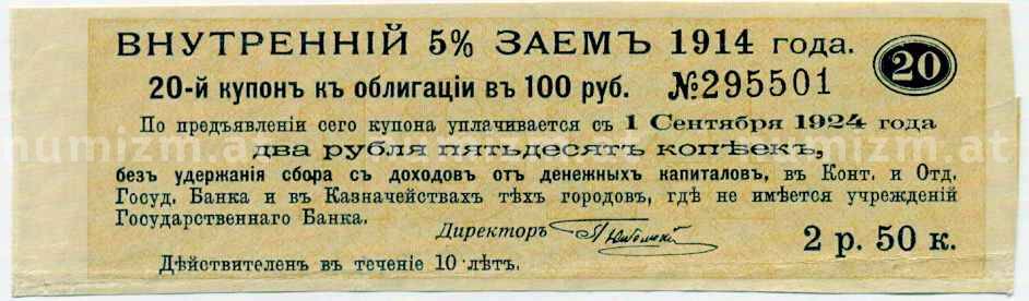 Интернет магазин «Нумизмат» предлагает приобрести Купон от облигации 100 рублей 1914 года «Внутренний заем».