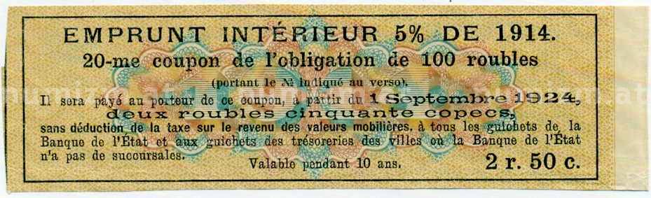 Купон от облигации 100 рублей 1914 года «Внутренний заем» [Артикул: T11-27125]