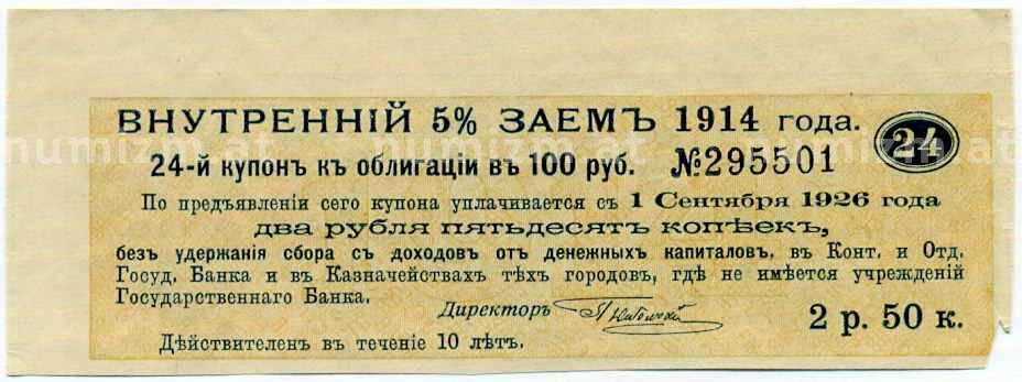 20.01.2025Интернет магазин «Нумизмат» предлагает приобрести Купон от облигации 100 рублей 1914 года «Внутренний заем».