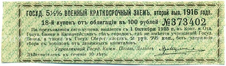 Купон от облигации 100 рублей 1916 года «Государственный военный краткосрочный заем» (Артикул: T11-27386): подробные характеристики, качественные фотографии в высоком разрешении, низкая цена.