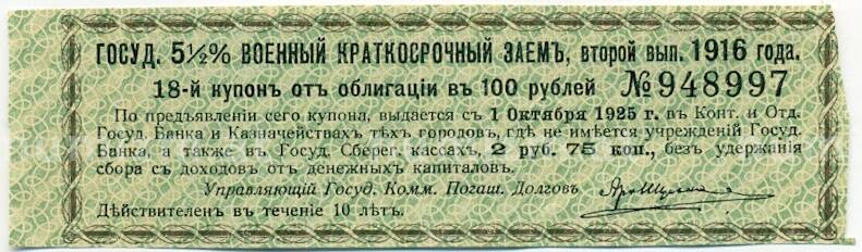 Купон от облигации 100 рублей 1916 года «Государственный военный краткосрочный заем» (Артикул: T11-27389): подробные характеристики, качественные фотографии в высоком разрешении, низкая цена.