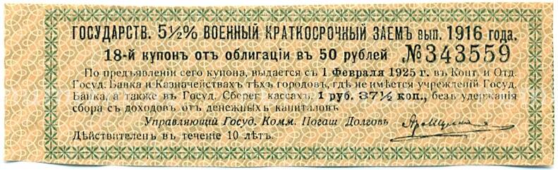 Купон от облигации 50 рублей 1916 года «Государственный военный краткосрочный заем» (Артикул: T11-27406): подробные характеристики, качественные фотографии в высоком разрешении, низкая цена.