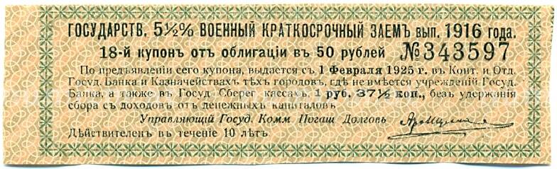 Купон от облигации 50 рублей 1916 года «Государственный военный краткосрочный заем» (Артикул: T11-27412): подробные характеристики, качественные фотографии в высоком разрешении, низкая цена.