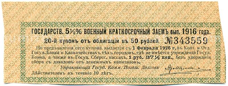 Купон от облигации 50 рублей 1916 года «Государственный военный краткосрочный заем» (Артикул: T11-27414): подробные характеристики, качественные фотографии в высоком разрешении, низкая цена.