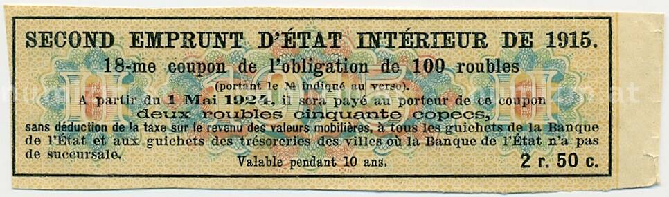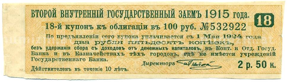 Купон от облигации 100 рублей 1915 года «Второй внутренний государственный заем» (Артикул: T11-27646): подробные характеристики, качественные фотографии в высоком разрешении, низкая цена.