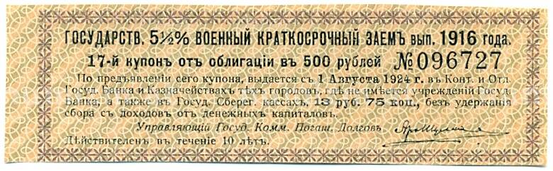 Купон от облигации 500 рублей 1916 года «Государственный военный краткосрочный заем» (Артикул: T11-27656): подробные характеристики, качественные фотографии в высоком разрешении, низкая цена.