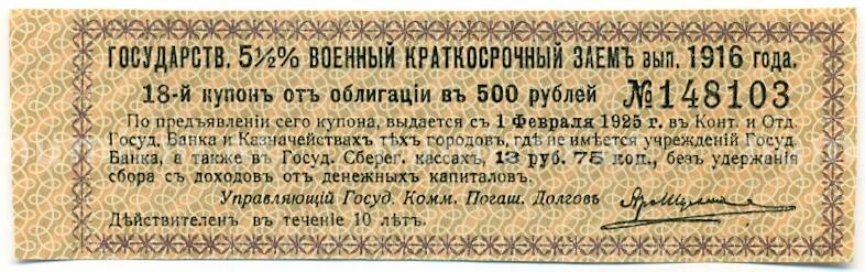 Купон от облигации 500 рублей 1916 года «Государственный военный краткосрочный заем» (Артикул: T11-27664): подробные характеристики, качественные фотографии в высоком разрешении, низкая цена.
