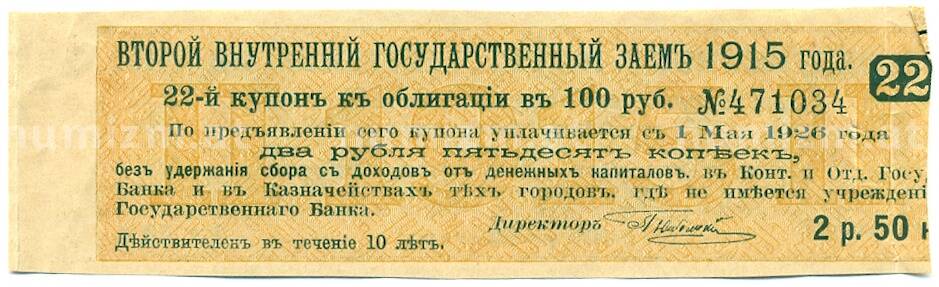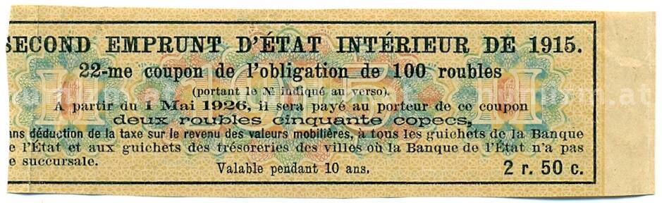 Купон от облигации 100 рублей 1915 года «Второй внутренний государственный заем» (Артикул: T11-27717): подробные характеристики, качественные фотографии в высоком разрешении, низкая цена.