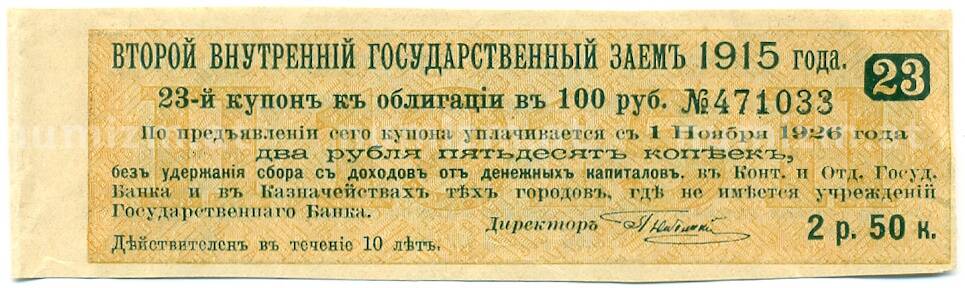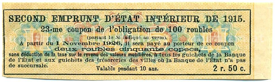 Купон от облигации 100 рублей 1915 года «Второй внутренний государственный заем» (Артикул: T11-27718): подробные характеристики, качественные фотографии в высоком разрешении, низкая цена.