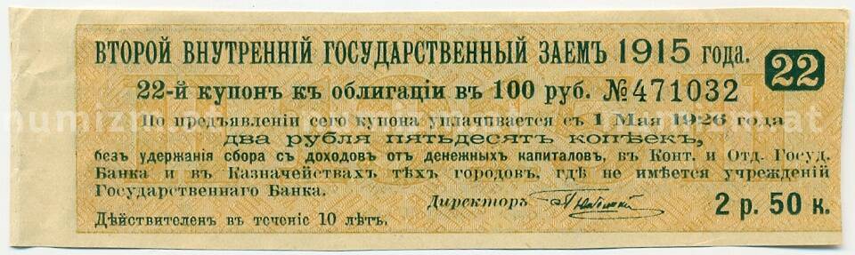 Интернет магазин «Нумизмат» предлагает приобрести Купон от облигации 100 рублей 1915 года «Второй внутренний государственный заем».