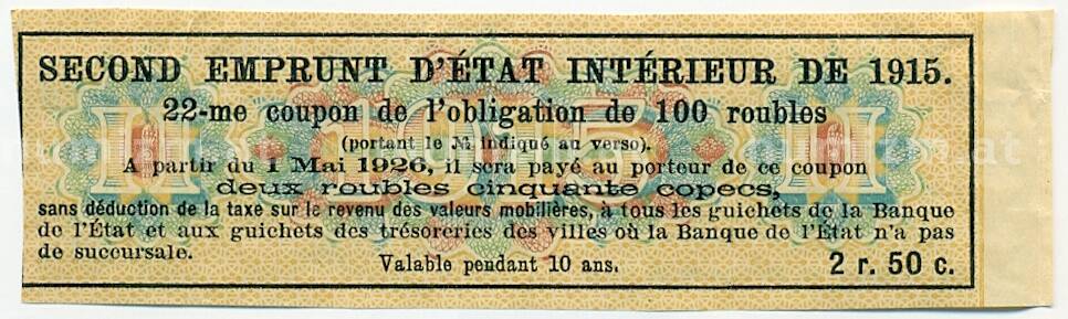 Купон от облигации 100 рублей 1915 года «Второй внутренний государственный заем» (Артикул: T11-27720): подробные характеристики, качественные фотографии в высоком разрешении, низкая цена.