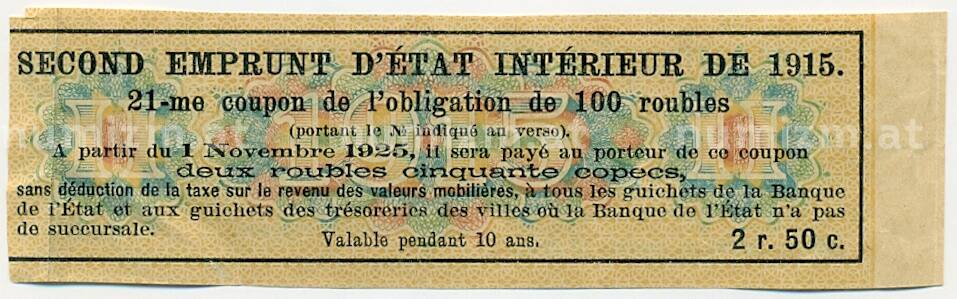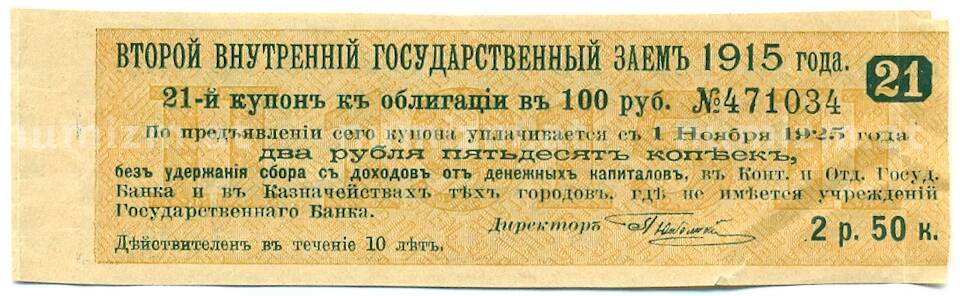 Купон от облигации 100 рублей 1915 года «Второй внутренний государственный заем» (Артикул: T11-27722): подробные характеристики, качественные фотографии в высоком разрешении, низкая цена.