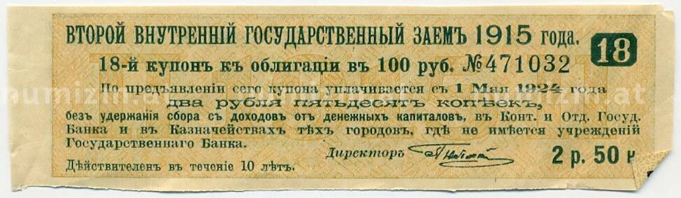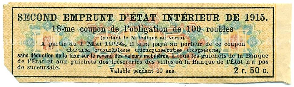 Купон от облигации 100 рублей 1915 года «Второй внутренний государственный заем» (Артикул: T11-27723): подробные характеристики, качественные фотографии в высоком разрешении, низкая цена.