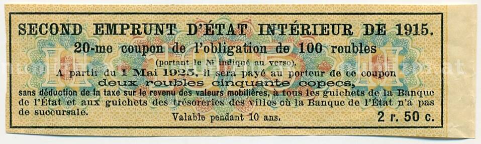 Купон от облигации 100 рублей 1915 года «Второй внутренний государственный заем» (Артикул: T11-27724): подробные характеристики, качественные фотографии в высоком разрешении, низкая цена.