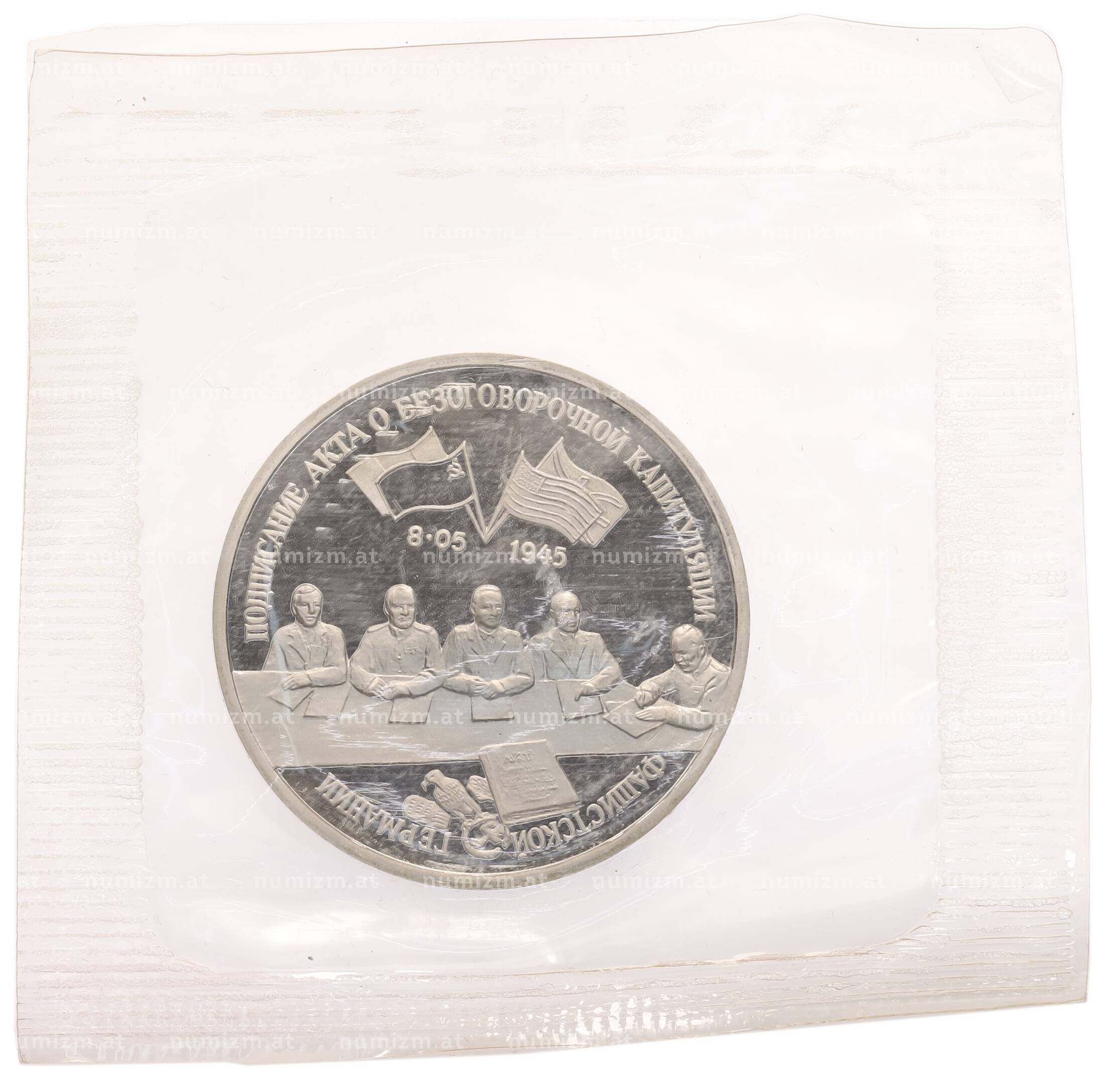 Купить 3 рубля 1995 года ЛМД «Подписание Акта о безоговорочной капитуляции фашистской Германии» по привлекательной цене можно в нашем интернет-магазине — Вам достаточно оформить заказ на сайте. Все монеты, представленные в каталоге, находятся в наличии на нашем складе.