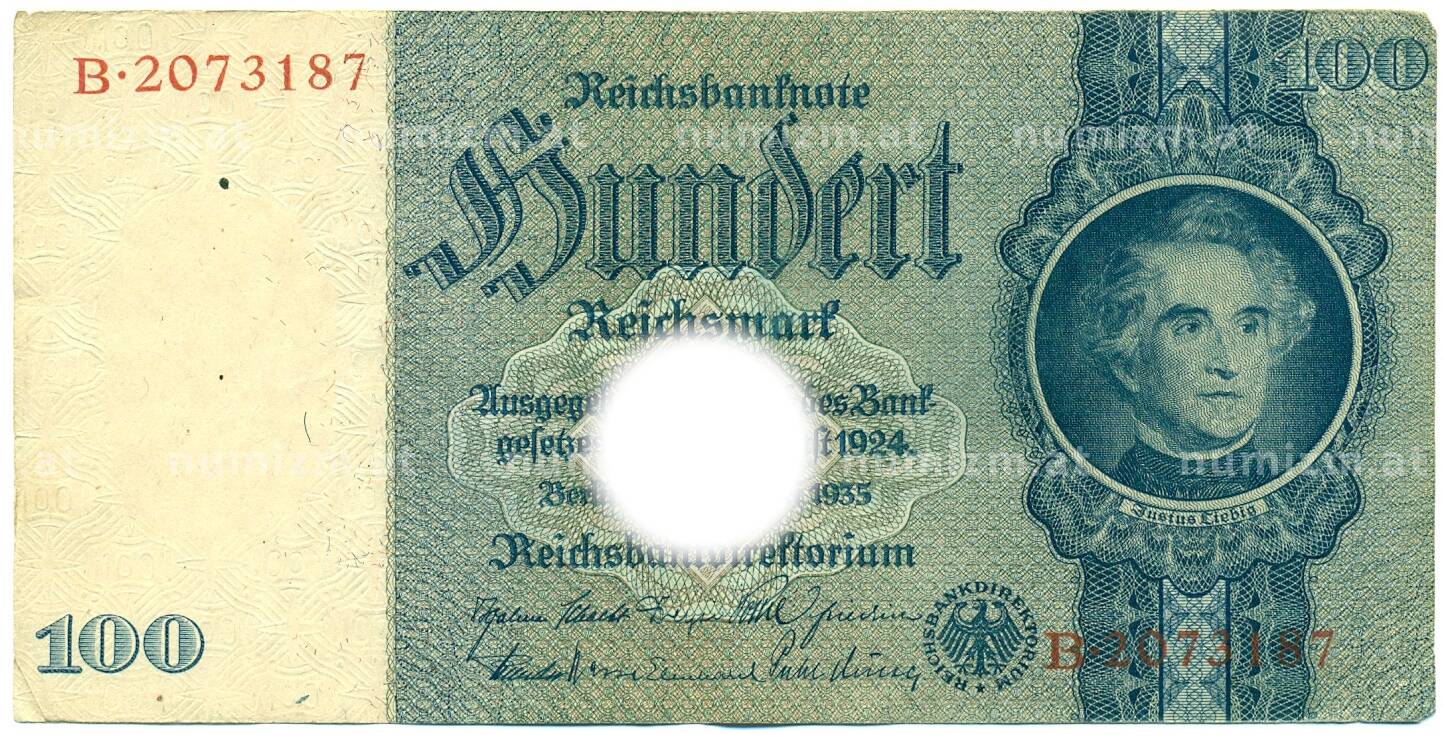 • Банкнота 100 рейхсмарок 1935 года Германия (Артикул: T11-28302) — Фото №1 Банкнота 100 рейхсмарок 1935 года Германия (Артикул: T11-28302) — Фото №2