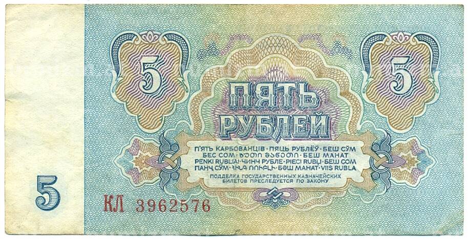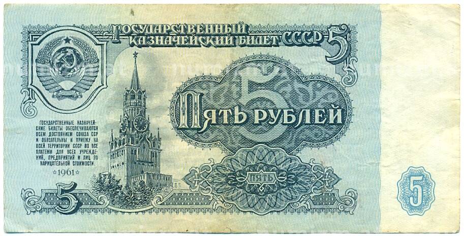 • Банкнота 5 рублей 1961 года (Артикул: T11-28675) — Фото №1 Банкнота 5 рублей 1961 года (Артикул: T11-28675) — Фото №2