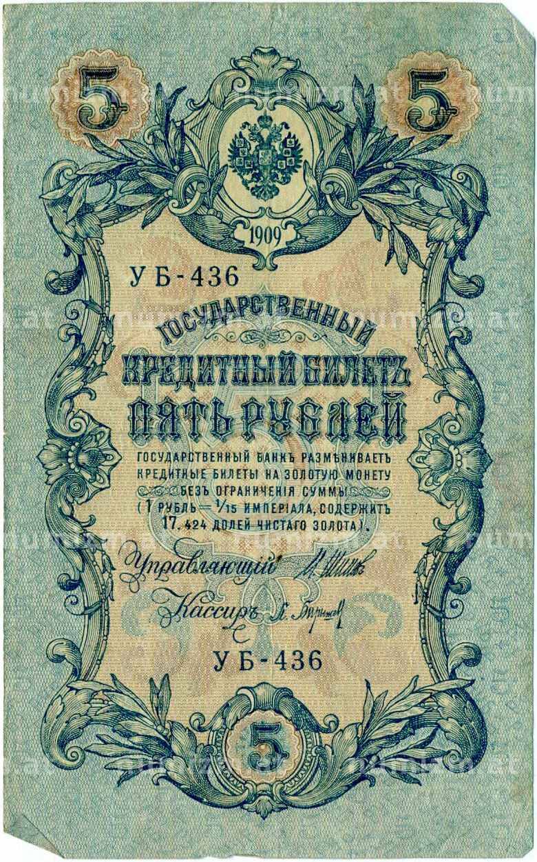Банкнота 5 рублей 1909 года Шипов / Барышев (Артикул: T11-29103): подробные характеристики, качественные фотографии в высоком разрешении, низкая цена.