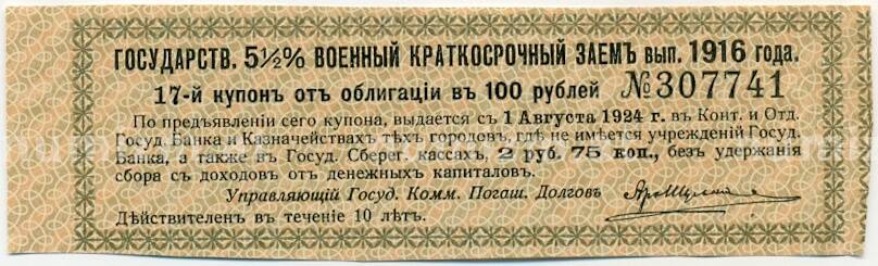 Купить Купон от облигации 100 рублей 1916 года «Государственный военный краткосрочный заем» по привлекательной цене можно в нашем интернет-магазине — Вам достаточно оформить заказ на сайте. Все монеты, представленные в каталоге, находятся в наличии на нашем складе.