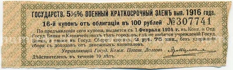 Купон от облигации 100 рублей 1916 года «Государственный военный краткосрочный заем» (Артикул: T11-29775): подробные характеристики, качественные фотографии в высоком разрешении, низкая цена.
