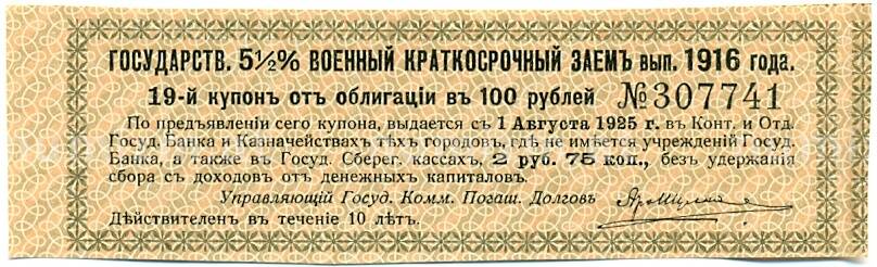 Купить Купон от облигации 100 рублей 1916 года «Государственный военный краткосрочный заем» по привлекательной цене можно в нашем интернет-магазине — Вам достаточно оформить заказ на сайте. Все монеты, представленные в каталоге, находятся в наличии на нашем складе.