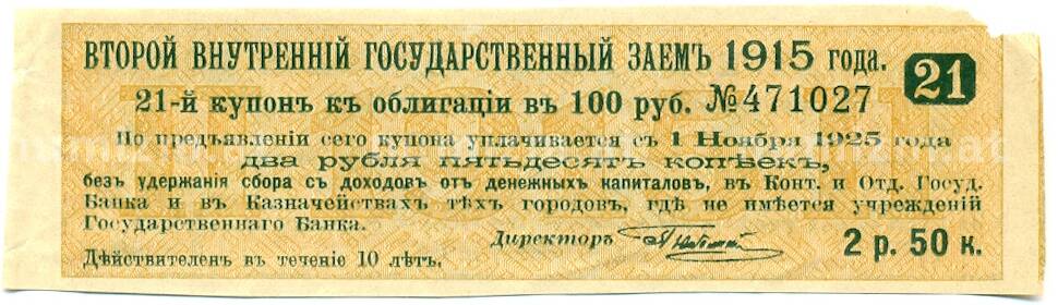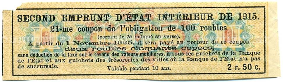 Купон от облигации 100 рублей 1915 года «Второй внутренний государственный заем» (Артикул: T11-29789): подробные характеристики, качественные фотографии в высоком разрешении, низкая цена.