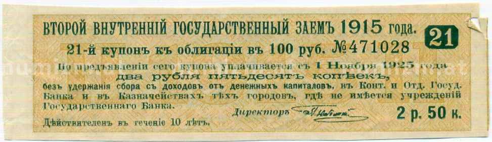 Интернет магазин «Нумизмат» предлагает приобрести Купон от облигации 100 рублей 1915 года «Второй внутренний государственный заем».