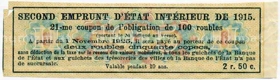 Купон от облигации 100 рублей 1915 года «Второй внутренний государственный заем» (Артикул: T11-29958): подробные характеристики, качественные фотографии в высоком разрешении, низкая цена.