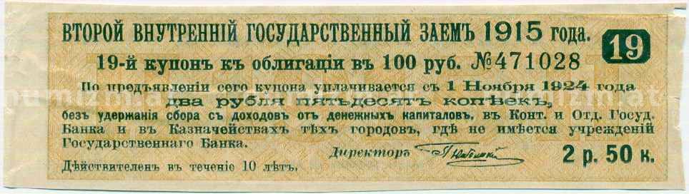 Интернет магазин «Нумизмат» предлагает приобрести Купон от облигации 100 рублей 1915 года «Второй внутренний государственный заем».