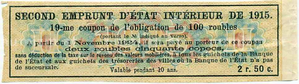 Купон от облигации 100 рублей 1915 года «Второй внутренний государственный заем» (Артикул: T11-29960): подробные характеристики, качественные фотографии в высоком разрешении, низкая цена.