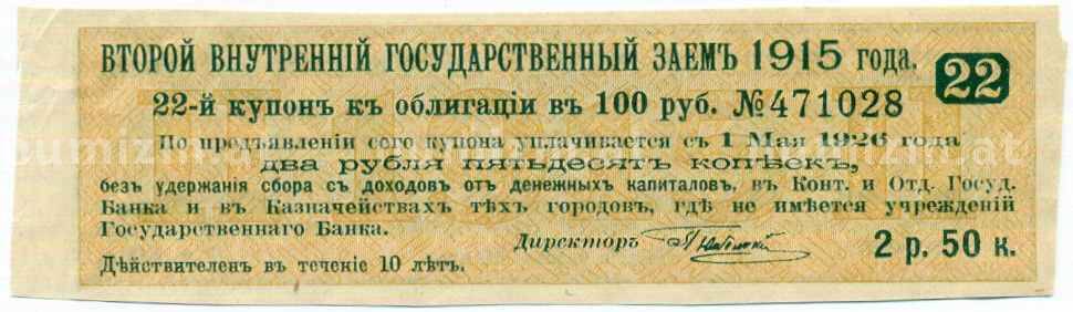 Интернет магазин «Нумизмат» предлагает приобрести Купон от облигации 100 рублей 1915 года «Второй внутренний государственный заем».