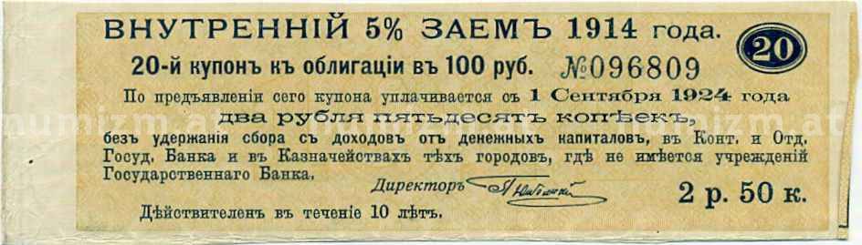 20.01.2025Интернет магазин «Нумизмат» предлагает приобрести Купон от облигации 100 рублей 1914 года «Внутренний заем».