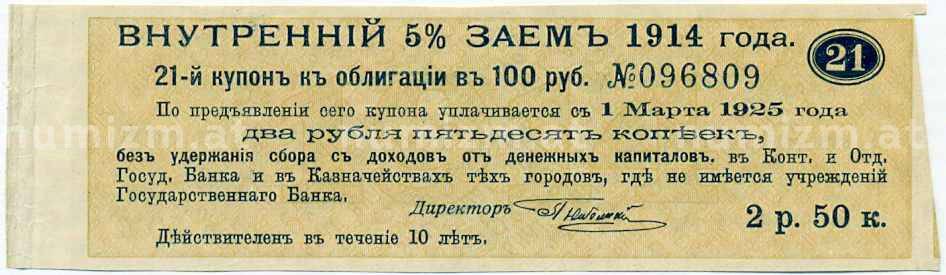 20.01.2025Интернет магазин «Нумизмат» предлагает приобрести Купон от облигации 100 рублей 1914 года «Внутренний заем».