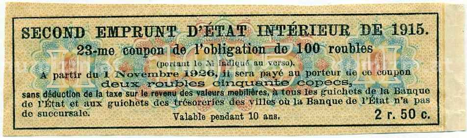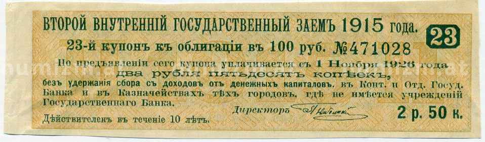 20.01.2025Интернет магазин «Нумизмат» предлагает приобрести Купон от облигации 100 рублей 1915 года «Второй внутренний государственный заем».