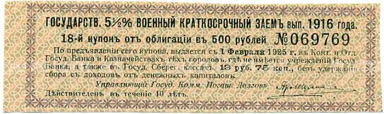 Купон от облигации 500 рублей 1916 года «Внутренний государственный краткосрочный заем» (Артикул: T11-29969): подробные характеристики, качественные фотографии в высоком разрешении, низкая цена.