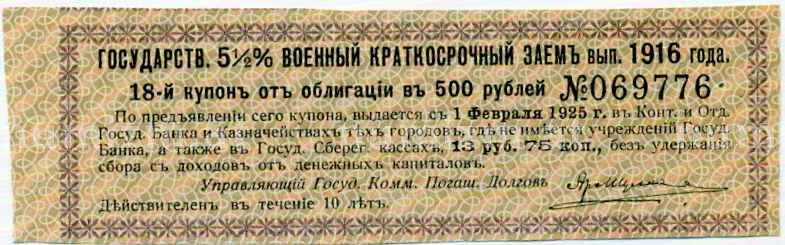 Купон от облигации 500 рублей 1916 года «Внутренний государственный краткосрочный заем» (Артикул: T11-29974): подробные характеристики, качественные фотографии в высоком разрешении, низкая цена.