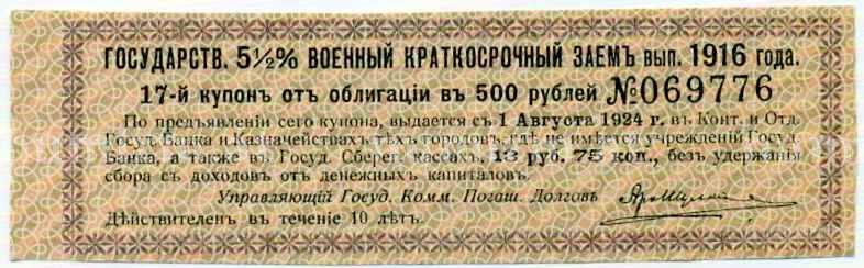 Купон от облигации 500 рублей 1916 года «Внутренний государственный краткосрочный заем» (Артикул: T11-29975): подробные характеристики, качественные фотографии в высоком разрешении, низкая цена.