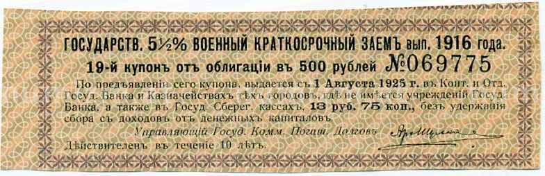 Купить Купон от облигации 500 рублей 1916 года «Внутренний государственный краткосрочный заем» по привлекательной цене можно в нашем интернет-магазине — Вам достаточно оформить заказ на сайте. Все монеты, представленные в каталоге, находятся в наличии на нашем складе.