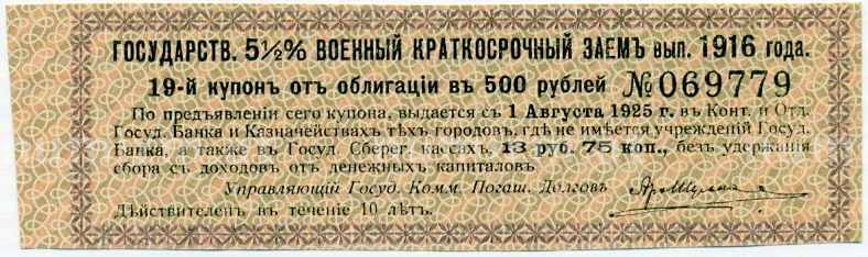 Купон от облигации 500 рублей 1916 года «Внутренний государственный краткосрочный заем» (Артикул: T11-29979): подробные характеристики, качественные фотографии в высоком разрешении, низкая цена.