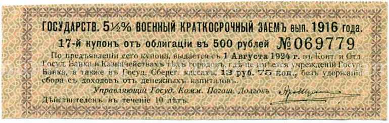 Купон от облигации 500 рублей 1916 года «Внутренний государственный краткосрочный заем» (Артикул: T11-29982): подробные характеристики, качественные фотографии в высоком разрешении, низкая цена.