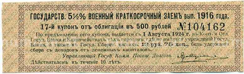 Купон от облигации 500 рублей 1916 года «Внутренний государственный краткосрочный заем» (Артикул: T11-29985): подробные характеристики, качественные фотографии в высоком разрешении, низкая цена.